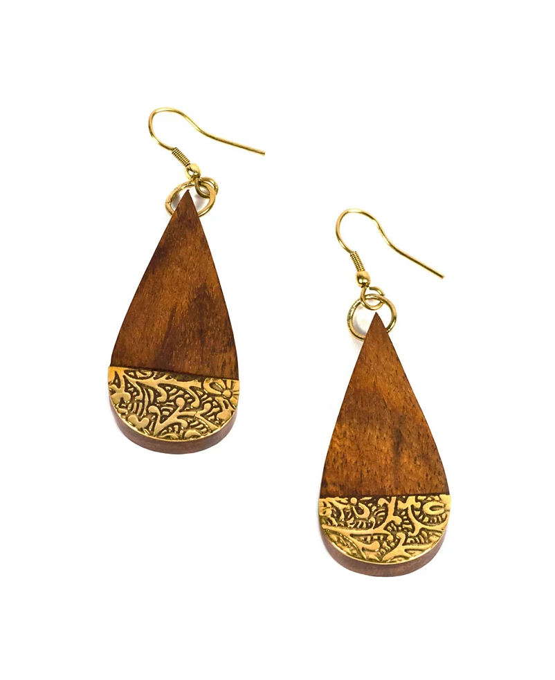 Inlays of brass with fauna-inspired etching accent these wooden teardrop shaped earrings. Brass hooks.