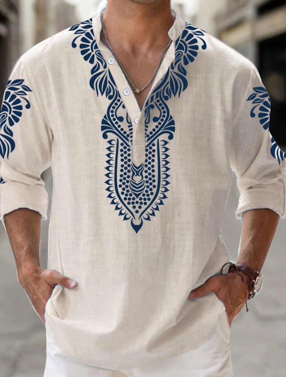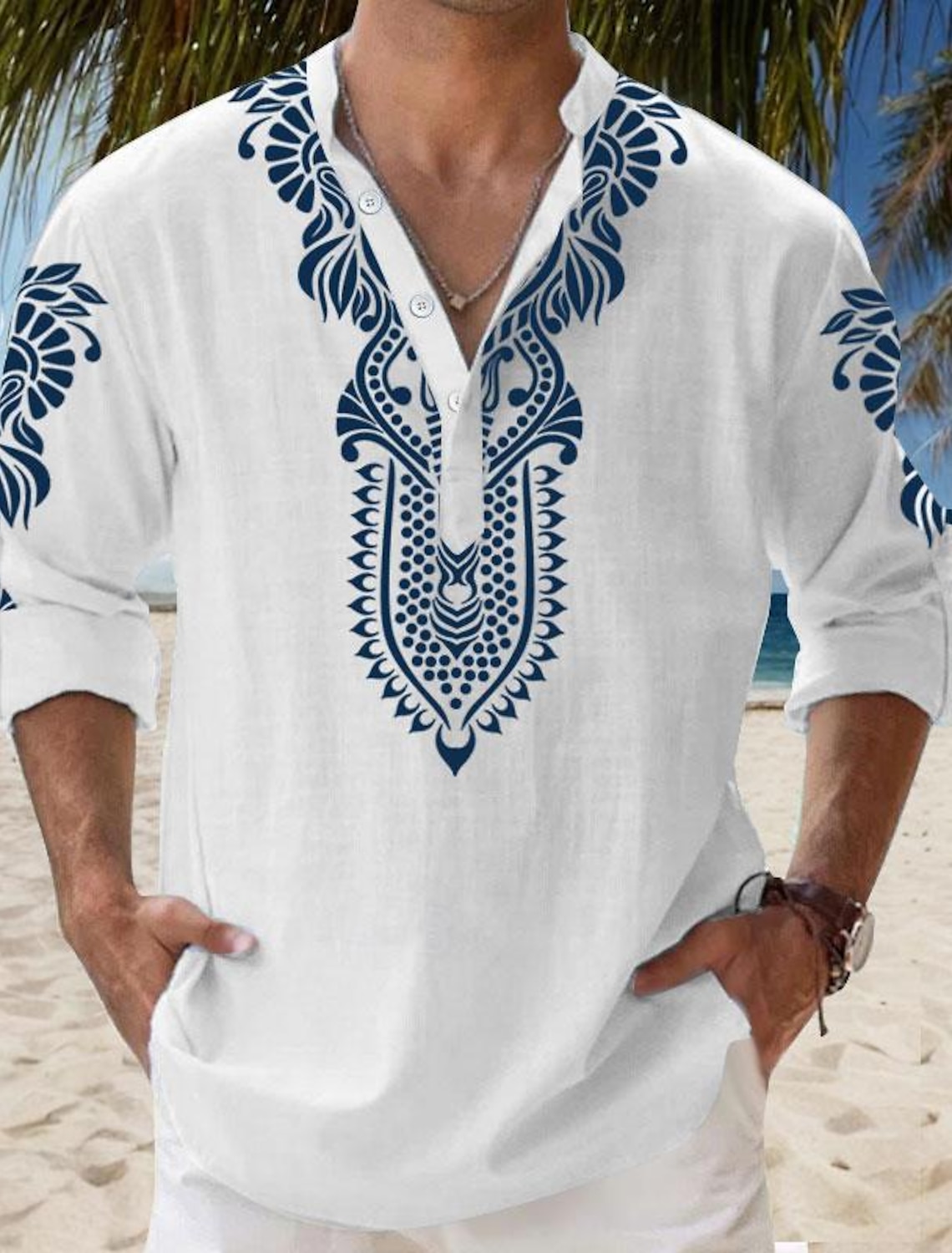 Fabric: Slub Fabric Gender: Men’s Tops Type: Shirt, Linen Shirt, Button Up Shirt Design: Print, Buttons Occasion: Going out, Vacation, Daily Wear Style: Tribal Category: Shirt Neckline: Stand Collar Sleeve Length: Long Sleeve Elasticity: Micro-elastic Look After Me: Wet and Dry Cleaning, Washable Pattern: Tribal, Ethnic, Bandana Print Season: Spring & Fall