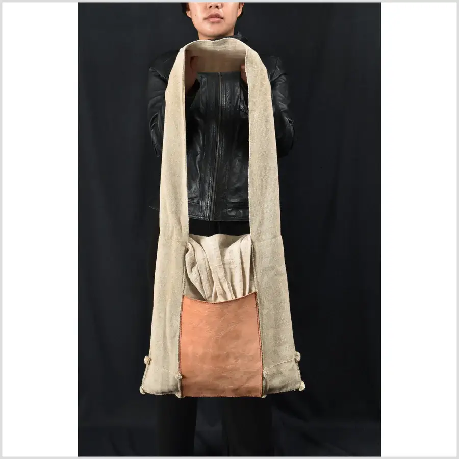 Kind Hum is made from a handwoven, unbleached, heavy-duty, hemp, in a lovely, neutral and natural beige. The front toss pocket is distressed natural vegetable tanned leather, as are the drawstring bag closures. To note: Each bag will display slightly different lines/creases/scars/color of the front leather pocket panel due to this distressing. Inside the bag are both an open toss pocket and a zippered pocket. The lining is a banded linen/cotton mix and the top of the bag can be closed up securely by pulling on the two leather drawstrings, as seen in the photos.